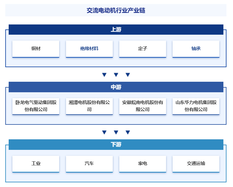交换电动机行业财产链上逛为原材料及焦点零部件,次要包罗铜材、绝缘材料、定子、财产链中逛次要为交换电动机的出产制制。财产链下逛次要使用于工业、汽车、家电、交通运输、农业等范畴。